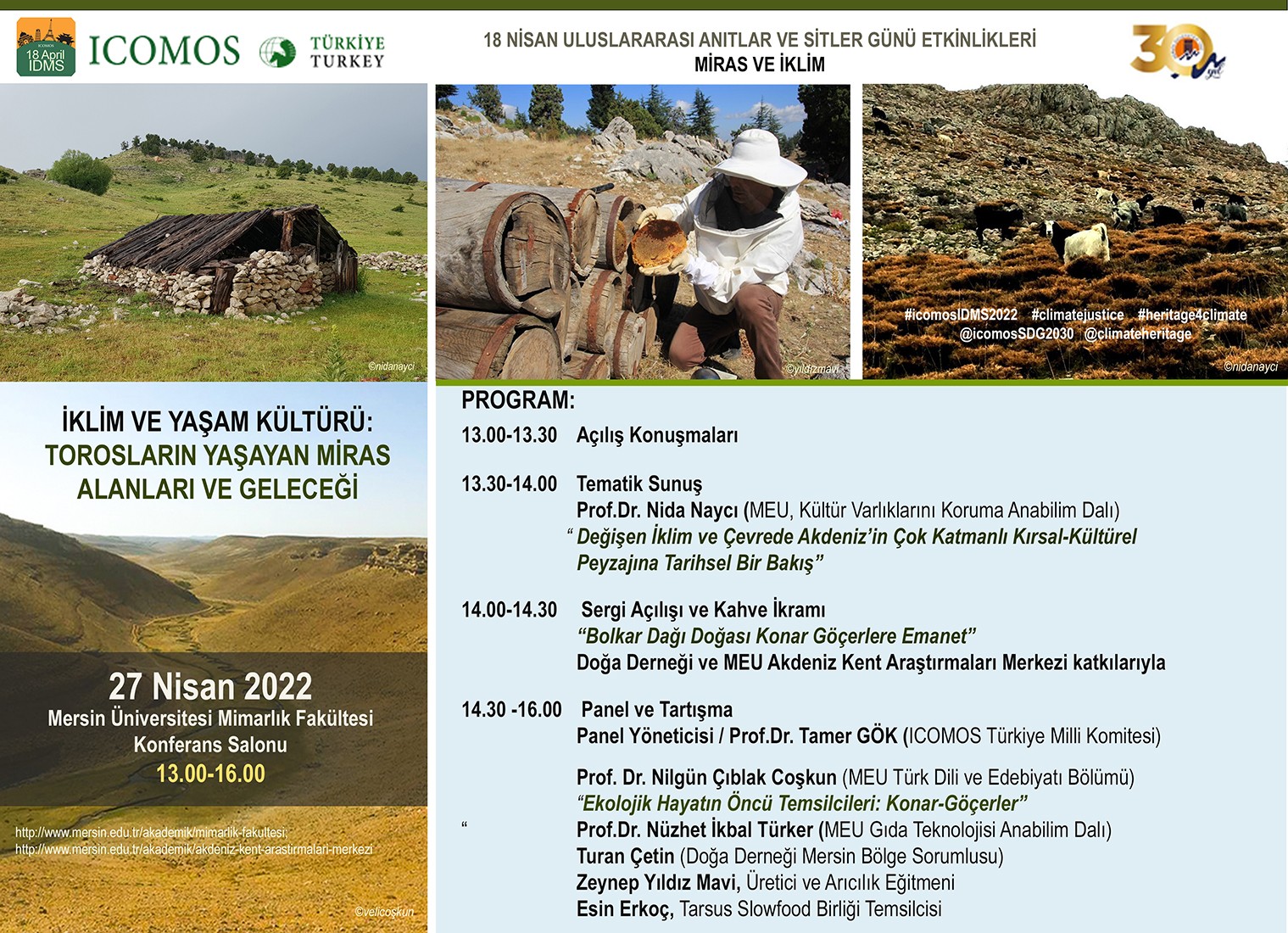Akdeniz havzasının kültür tarihinde önemli yer tutan konar-göçer gruplar; kıyı düzlükleri ile Toros Dağları arasındaki iklimsel ve coğrafi farklılıkları; mevsimlik göç hareketleri ile birbirine örüntüleyen; yüzyıllar içerisinde yaşadıkları çevreye karşı geliştirdikleri uyum ve yaşam kültürüyle Torosların kültürel peyzajının şekillenmesine katkı koyan önemli yaşayan miras değerleridir. ICOMOS tarafından 18 Nisan Uluslararası Anıtlar ve Sitler Günü 2022 yılı teması “Miras ve İklim” olarak belirlenmiştir. “İklim ve Yaşam Kültürü: Torosların Yaşayan Miras Alanları ve Geleceği” temalı panel/sergi etkinliği kapsamında; Mersin Torosların yaşayan mirası Konar-Göçer kültürün sahip olduğu geleneksel bilgilerin kültür/çevre ilişkisindeki önemi; ve de bu bilgilerin sürdürülebilir iklim ve çevre yönetimindeki potansiyel rollerine dikkat çekilmesi amacıyla farklı disiplinlerden uzmanların ve kaynak kişilerin deneyimlerini aktaracağı bir paylaşım ortamı amaçlanmaktadır.