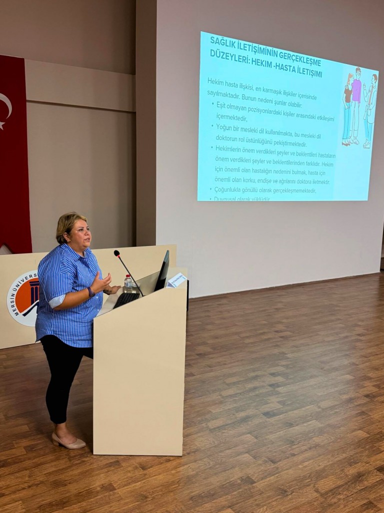 Mersin Üniversitesi Hastanesi sağlık personeline yönelik “Hasta ve Sağlık Personeli İletişimi” konulu etkili iletişim semineri düzenlendi. Seminere hasta bakıcı, hemşire, sekreter ve çeşitli birimlerde görev yapan sağlık çalışanları katıldı.