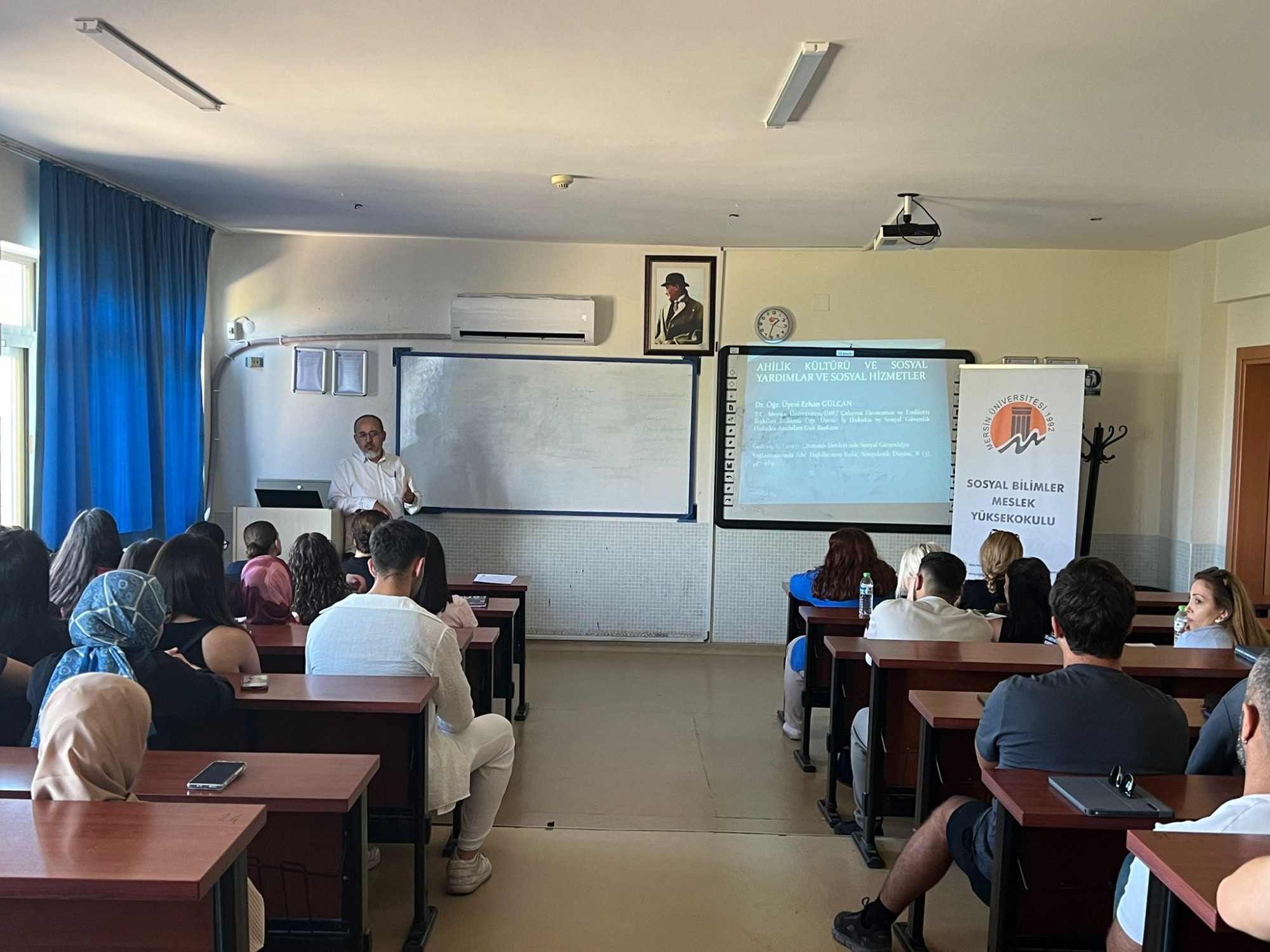 Programın açılış konuşmasını, “Ahiliğin Önemi ve Etik” başlıklı sunumuyla Sosyal Bilimler Meslek Yüksekokulu Müdürü Prof. Dr. İlhan Ege yaptı. Prof. Dr. Ege, konuşmasında ahilik geleneğinin yalnızca esnaf teşkilatı değil, aynı zamanda toplumsal dayanışma, dürüstlük ve mesleki etik ilkelerinin kök saldığı bir yaşam felsefesi olduğunu vurguladı. Ardından, Çalışma Ekonomisi ve Endüstri İlişkileri Bölümü öğretim üyesi Dr. Öğr. Üyesi Erhan Gülcan tarafından “Sosyal Yardımlar ve Sosyal Hizmetler” konulu konferans gerçekleştirildi. Dr. Öğr. Üyesi Gülcan, sosyal yardımların tarihsel gelişiminden ve günümüz sosyal politika uygulamalarıyla olan ilişkilerinden söz ederek, katılımcı öğrencilerin sorularını yanıtladı.