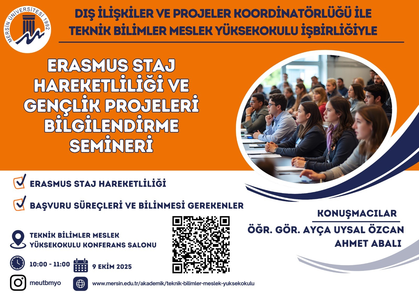 Üniversitemiz Dış İlişkiler ve Projeler Koordinatörlüğü tarafından öğrencilerimize yönelik “Erasmus Staj Hareketliliği ve Gençlik Projeleri Bilgilendirme ” konulu eğitim, Öğr. Gör. Ayça UYSAL ÖZCAN ve Arif ABALI tarafından 9 Ekim 2025 Perşembe günü saat 10.00’da Meslek Yüksekokulumuz Konferans Salonu’nda gerçekleştirilmiştir.