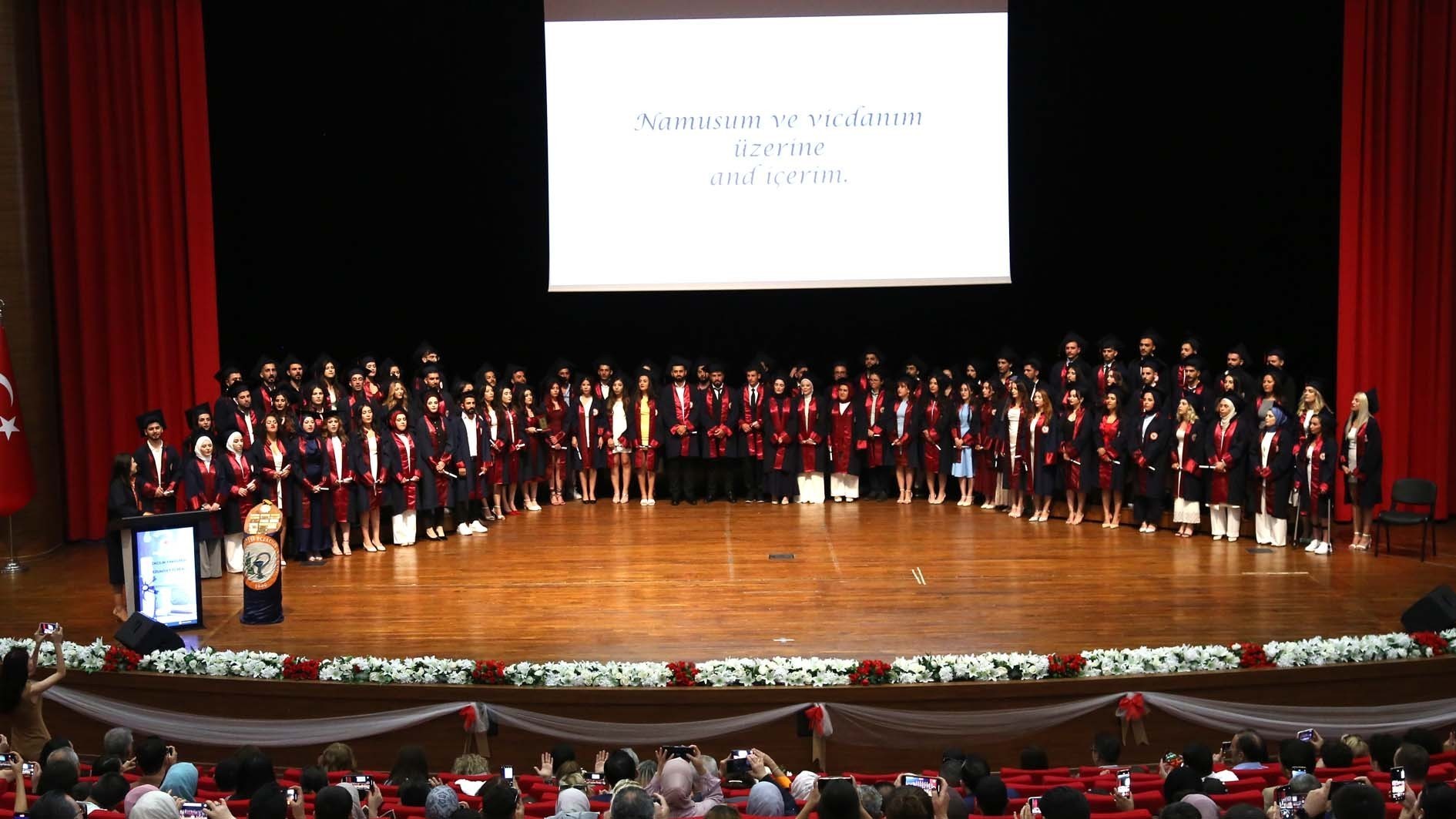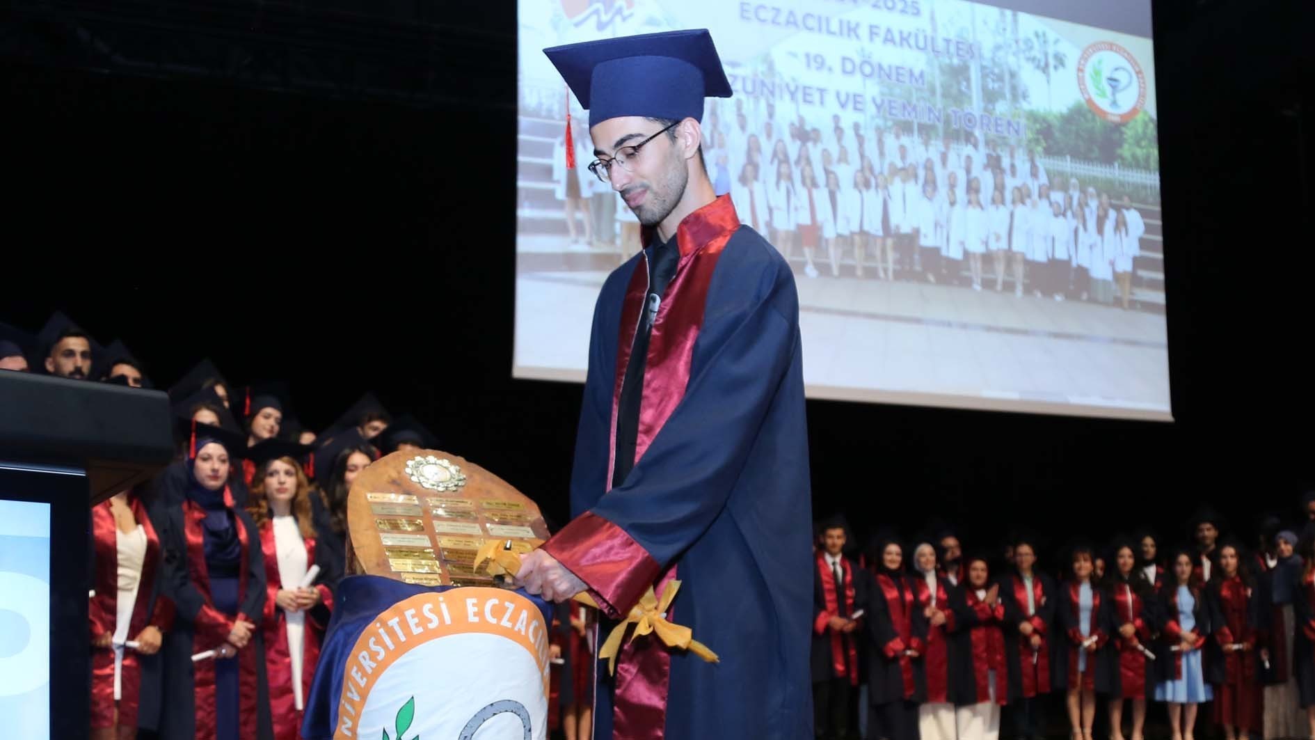 Açılış konuşmalarının ardından dönem birincisi Ecz. Şerifali GÜNGÖR’ün mezuniyet ağacına dönem plaketini çakmasıyla tören devam etti. Daha sonra, Ecz. Dr. Öğr. Üyesi Meryem TEMİZ REŞİTOĞLU’nun eşliğinde mezunlar meslek andını etti.