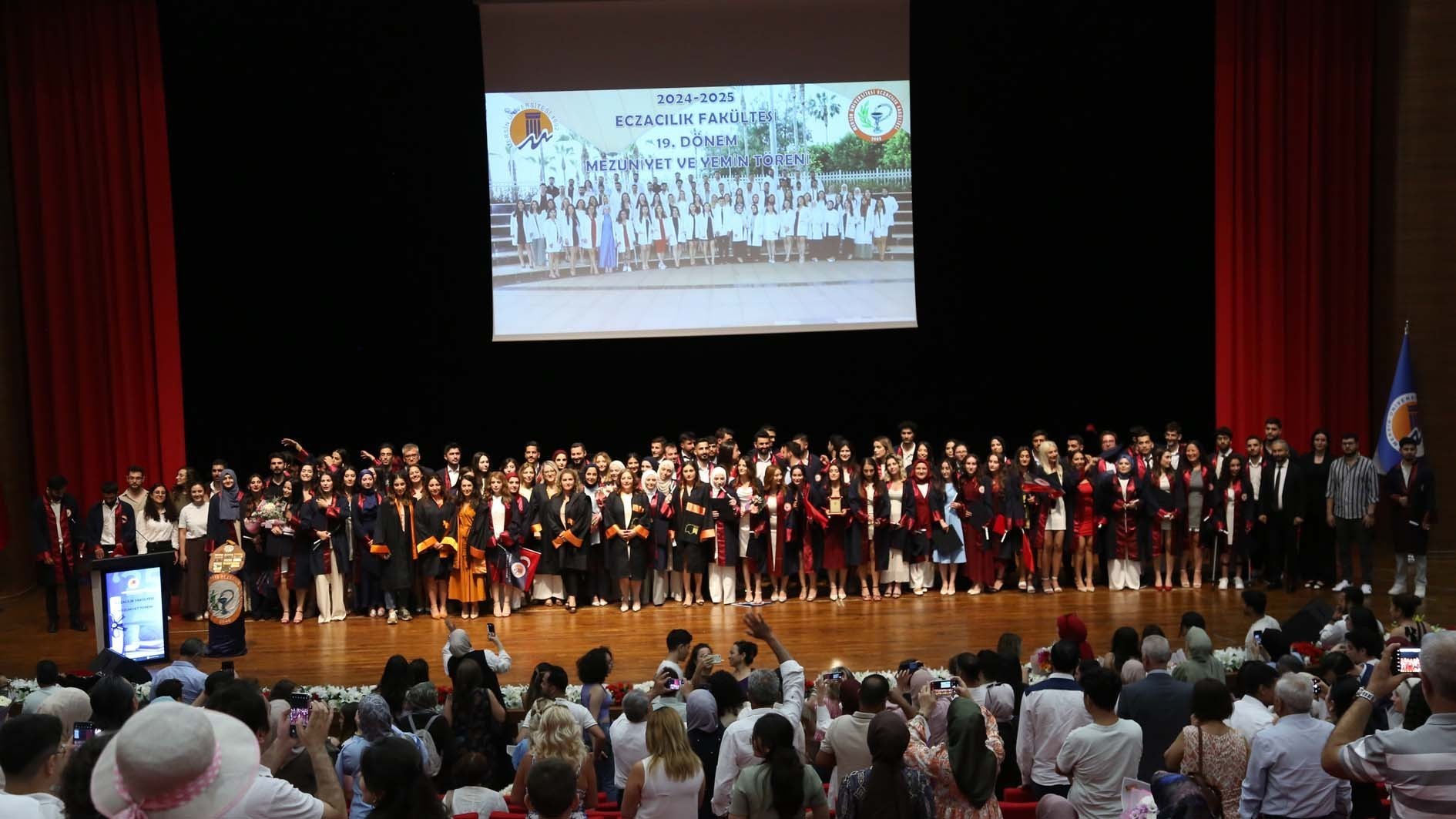 Fakültemizin 2024–2025 Akademik Yılı Mezuniyet ve Yemin Töreni, 25 Haziran 2025 Çarşamba günü Üniversitemiz Akdeniz Kültür Merkezi’nde büyük bir coşku ile gerçekleştirildi. Törene; Mersin Üniversitesi Rektör Yardımcısı Prof. Dr. Ahmet Hakan ÖZTÜRK, Fakültemiz Dekanı Prof. Dr. Necmiye CANACANKATAN, Diş Hekimliği Fakültesi Dekanı Prof. Dr. Fethi ATIL, Sağlık Bilimleri Fakültesi Dekanı Prof. Dr. Duygu VEFİKULUÇAY YILMAZ, 25. Bölge Mersin Eczacı Odası Genel Sekreteri Ecz. Cemil Oktay ASLAN, Güney Ecza Kooperatifi Yönetim Kurulu Üyesi Ecz. Yasemin EMRE, İdari ve Mali İşler Daire Başkanı Osman Nuri RAMAZAN, akademik ve idari personel ile mezun öğrenciler ve aileleri katıldı.