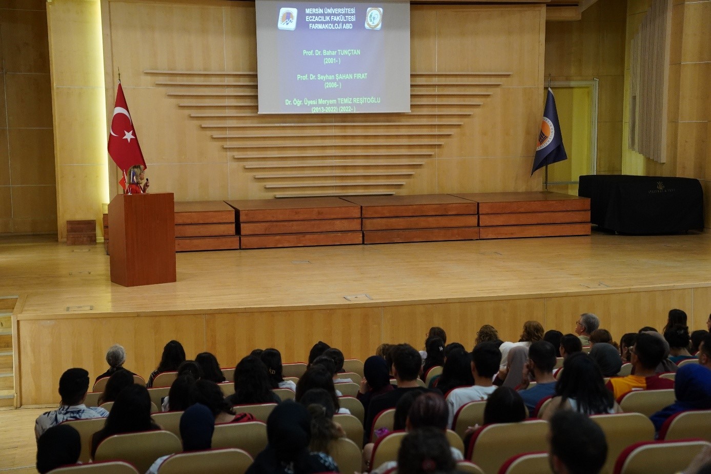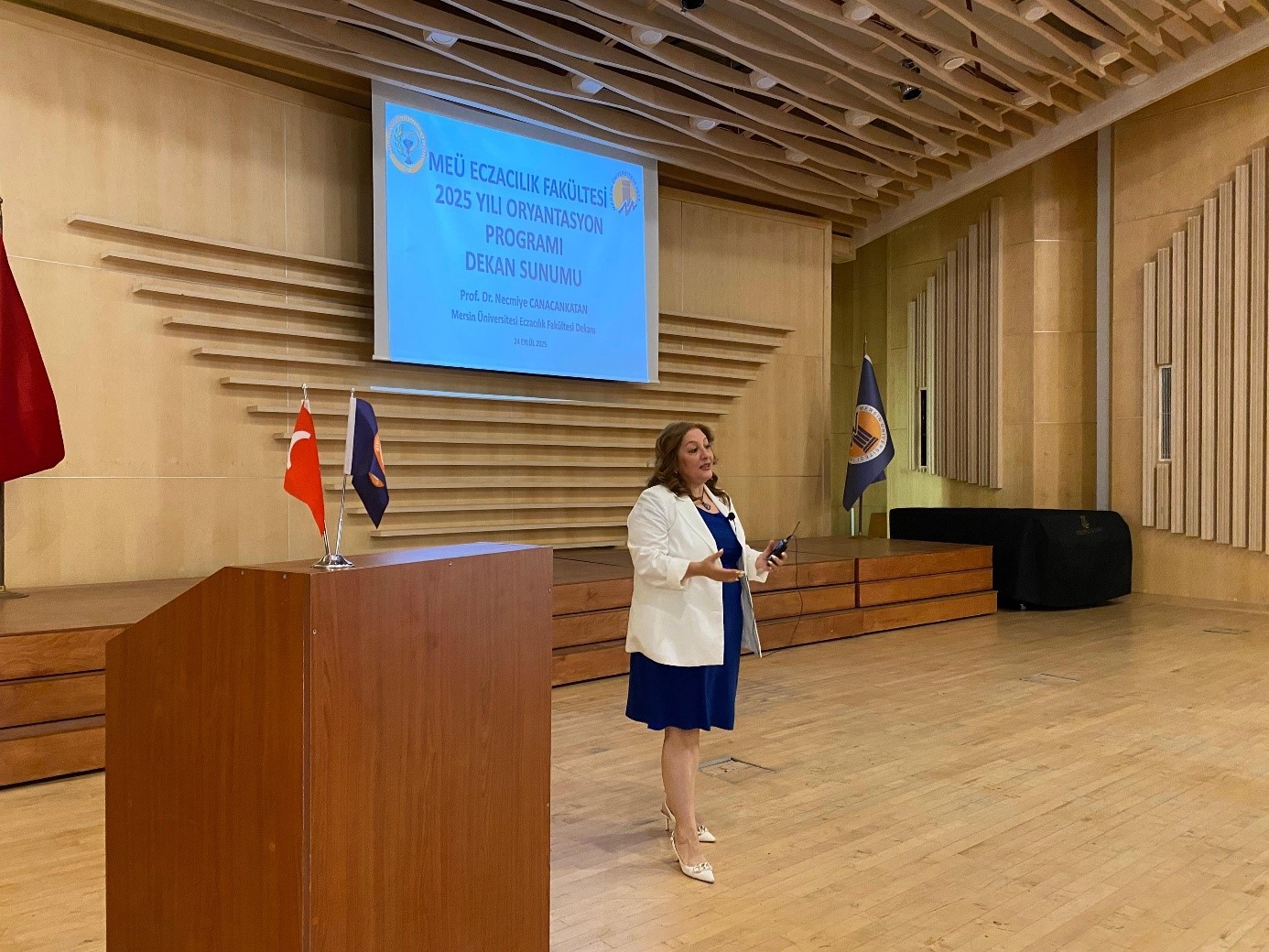 24 Eylül 2025 Pazartesi tarihinde, Yenişehir Kampüsü Nevit Kodallı Konferans Salonunda gerçekleştirilen Fakültemiz oryantasyon programına Fakültemiz Dekanı Prof. Dr. Necmiye CANACANKATAN, Dekan yardımcıları Doç. Dr. Mahmut ÜLGER ve Dr. Öğr. Üyesi Şerife Efsun ANTMEN, Fakültemiz öğretim elemanları, Fakülte Sekreterimiz Volkan DARÇIN, Fakülte idari personelimiz ve birinci sınıf Eczacılık Fakültesi öğrencileri katıldı. Fakültemiz Dekanı Prof. Dr. Necmiye CANACANKATAN, akademik ve idari yapılanmaya dair açıklamaların sonrasında, Fakültemizin eğitim-öğretim ve akademik çalışmaları hakkında bilgilendirmede bulundu. Prof. Dr. Necmiye CANACANKATAN konuşmasında “Ocak 2019 yılı itibariyle ECZAKDER tarafından tam akreditasyona sahip olan Fakültemizin 2031 yılına kadar ikinci kez akredite edilerek bu başarısının sürdüğünü ifade etti. Ayrıca Fakültemizin Türkiye Yeterlilikler Çerçevesi’ne (TYÇ) sahip olduğunu bildirdi. Mersin Üniversitesi Eczacılık Fakültesinin alanında yetkin ve başarılı bir akademik kadroya sahip olduğunu, toplum sağlığına yönelik pek çok etkinlik düzenlendiğini ve Abdi İbrahim ile Eczacıbaşı İlaç firmalarıyla sanayi iş birliği protokolleri imzalandığını aktardı. Eğitim-öğretim süreçlerinin yanı sıra sanat, kültür ve sosyal etkinliklere de önem verdiklerini vurgulayan Prof. Dr. Necmiye CANACANKATAN, Fakülte tarafından birçok sosyal sorumluluk etkinliklerinin hayata geçirildiğini belirtti. Ayrıca, Üniversitemizin güçlü akademik ve sosyal altyapısına dikkat çekerek öğrencilerin bu olanaklardan yararlanarak kendilerini geliştirmelerini önerdi.