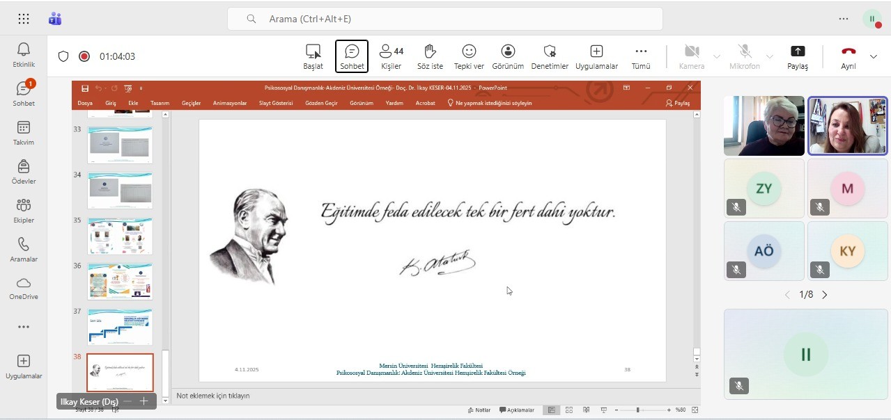 04 Kasım 2025 tarihinde saat 14.00 te Fakültemiz Ruh Sağlığı ve Hastalıkları Hemşireliği Ana Bilim Dalı ve Psikososyal Danışmanlık Komisyonu tarafından “Hemşirelik Öğrencisini Desteklemede Psikososyal Danışmanlık: Akdeniz Üniversitesi Hemşirelik Fakültesi Örneği” başlıklı çevrim içi bir etkinlik düzenlendi. Etkinlik 45 öğretim üyesi ve mentörün katılımıyla gerçekleştirildi. Akdeniz Üniversitesi Hemşirelik Fakültesi Psikiyatri Hemşireliği Ana Bilim Dalı öğretim üyesi Doç. Dr. İlkay KESER konuşmacı olarak yer aldı. Etkinlikte, hemşirelik öğrencilerinin psikososyal açıdan desteklenmesine yönelik iyi uygulama örnekleri paylaşıldı.