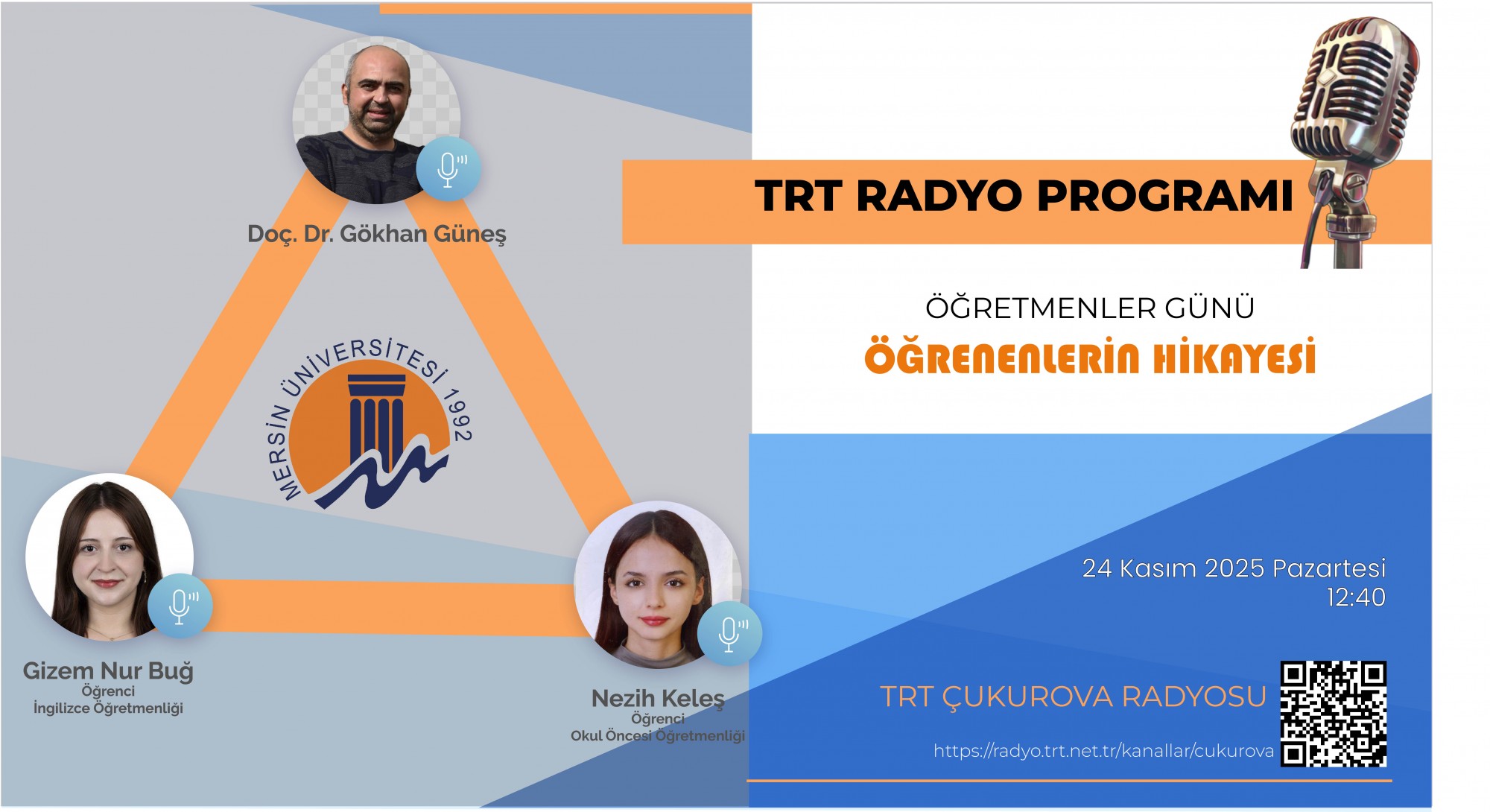 - 24 Kasım Saat 12:40'da Doç. Dr. Gökhan Güneş TRT Çukurova Radyosuna konuk olacak ve "Öğretmenlerin Hikayesi konulu bir söyleşide bulunacaktır.
