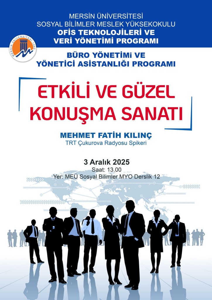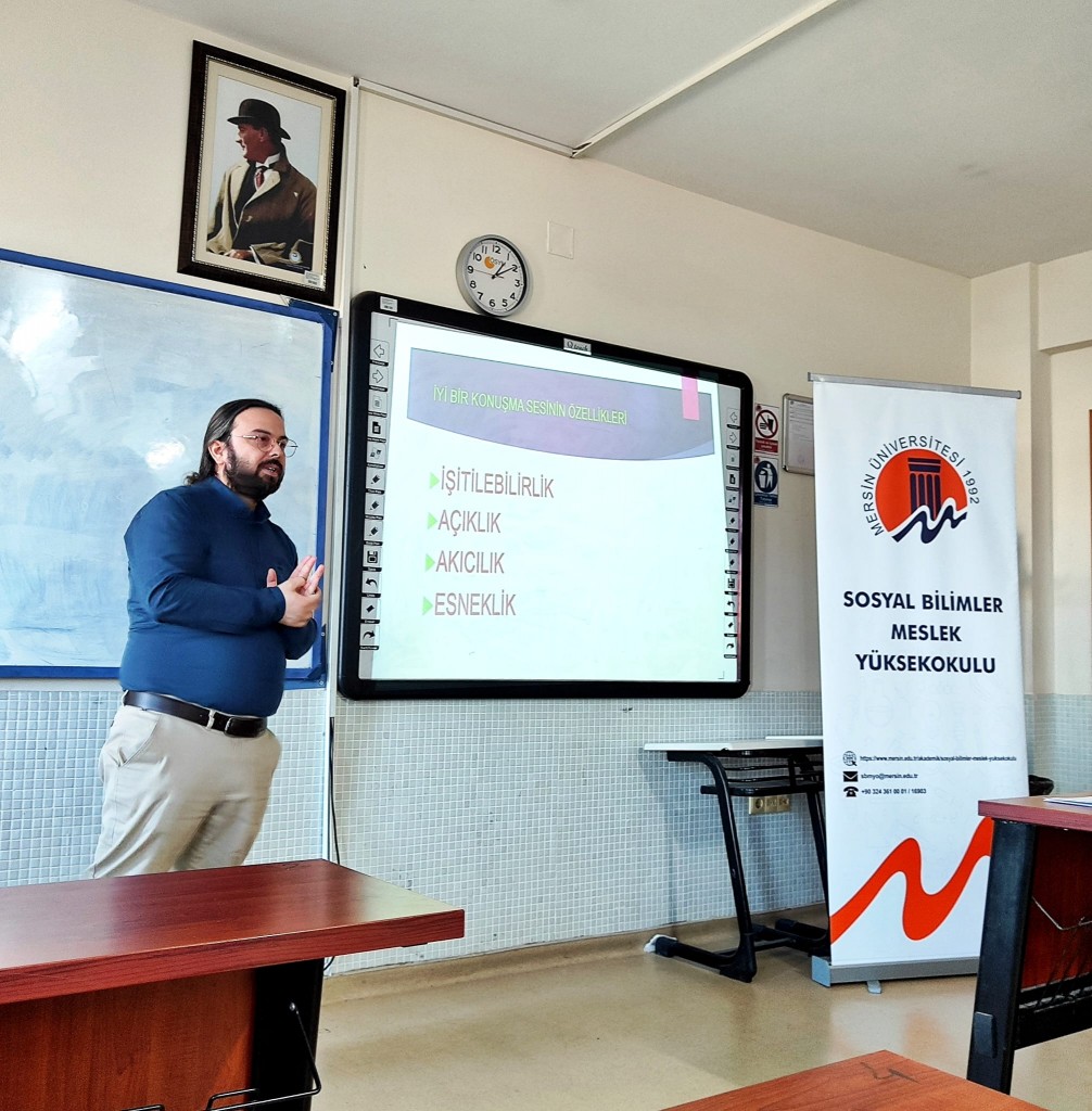 Mersin Üniversitesi Sosyal Bilimler Meslek Yüksekokulu Büro Hizmetleri ve Sekreterlik Bölümü ile Büro Yönetimi ve Yönetici Asistanlığı Programı “Etkili ve Güzel Konuşma” dersi, Ofis Teknolojileri ve Veri Yönetimi Programı “İletişim” dersi kapsamında önemli bir eğitim etkinliğine ev sahipliği yaptı. 03 Aralık 2025 tarihinde saat 13.00’te gerçekleştirilen seminer, TRT Çukurova Radyosu Spikeri Mehmet Fatih Kılınç’ın katılımıyla gerçekleşti.